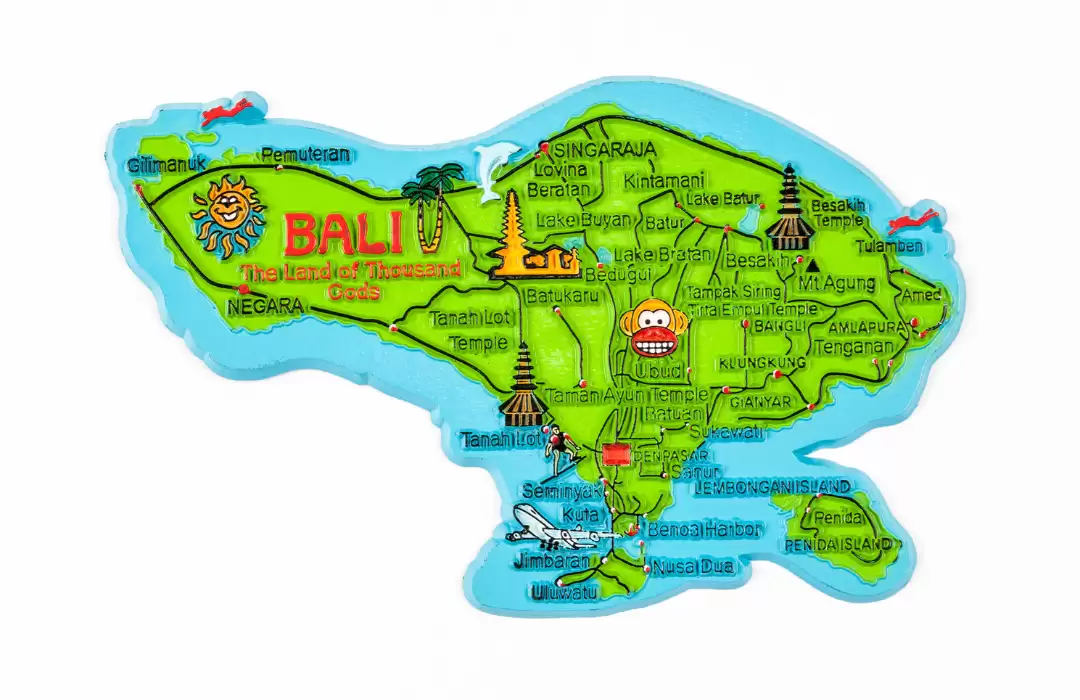 Le sud est la zone touristique principale, avec des plages animées et des stations comme Kuta et Sanur. Les visiteurs peuvent y pratiquer des sports nautiques ou profiter de coins plus tranquilles comme Jimbaran.